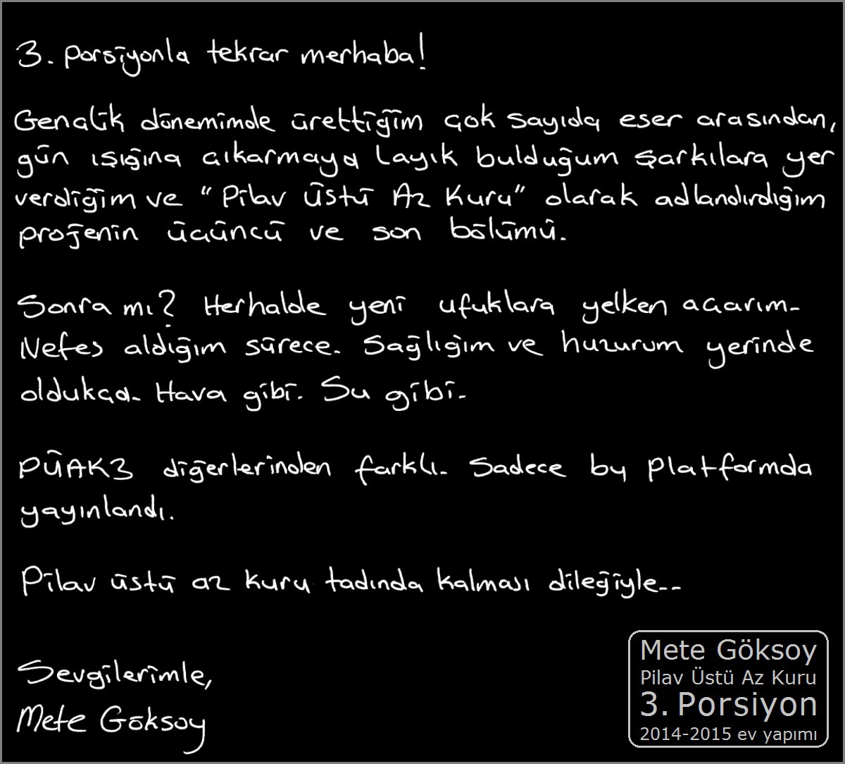 Her zaman olduğu gibi, bu albümde de duyduklarınız|duyacaklarınız ben Mete Göksoy [kısaca Mete Oğuz Göksoy] tarafından bestelenmiş, yazılmış, düzenlenmiş, çalınmış, söylenmiş ve kaydedilmiştir. Tüm kayıtlar, editing, mix ve mastering yine ‘evde çok başıma’ yapılmıştır. Kurt-ense olayına ise daha fazla girmek istemiyorum. |